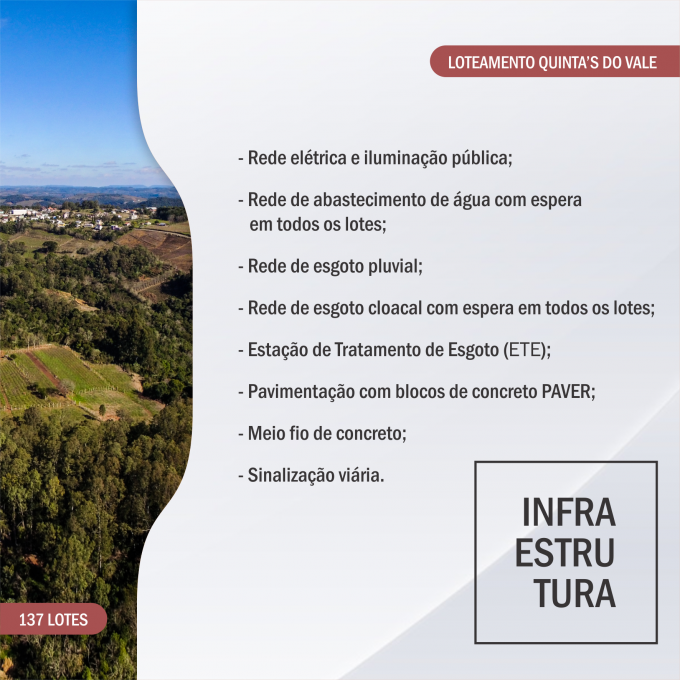 O Loteamento Quinta s do Vale é o segundo empreendimento da empresa no Município de Monte Belo do Sul, na Serra Gaúcha. Com vista para o Vale Ancantara, na região do Vale dos Vinhedos, o Loteamento Quinta s do Vale conta com 137 lotes residenciais, em uma área total de 104.242,72m .